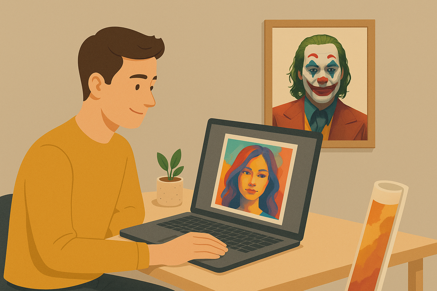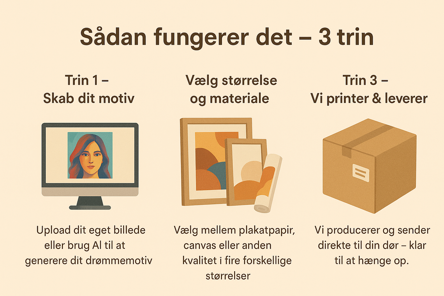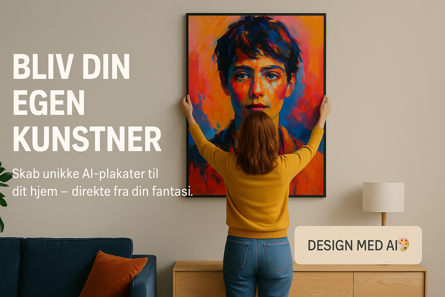 Hos NemKunst designer du dine egne plakater med kunstig intelligens – eller med dine egne billeder. Du vælger størrelsen, materialet og stilen. Vi trykker og leverer direkte til din dør.